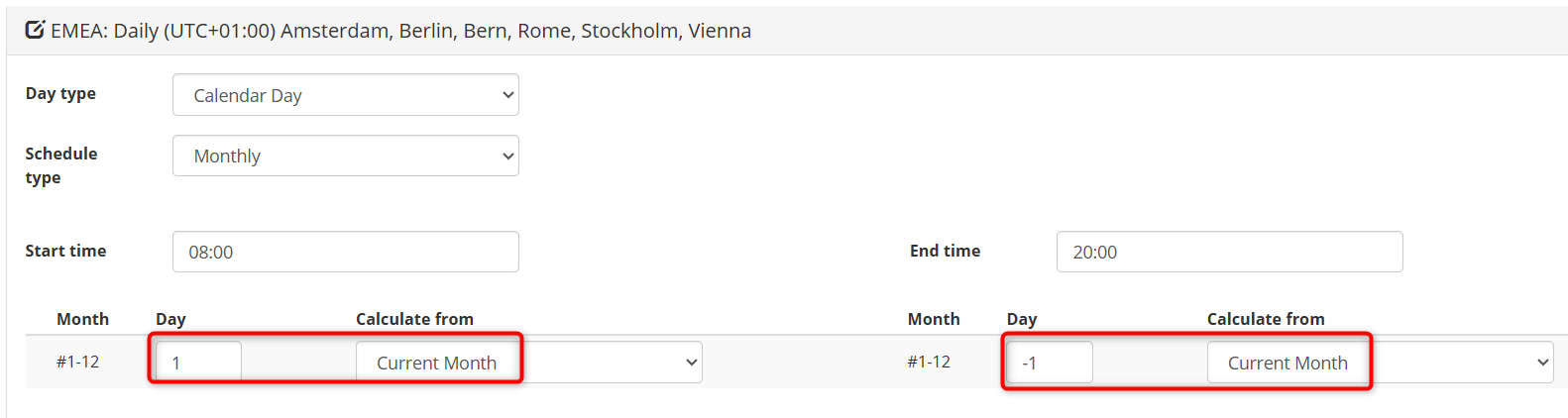 - It is very likely that you will want a schedule group that starts on calendar day 1 and ends on the last calendar day of the period. This is done by setting the schedule from Day 1 to Day -1 of the current period. This may feel a bit counterintuitive but day -1 means the last day of the associated month.