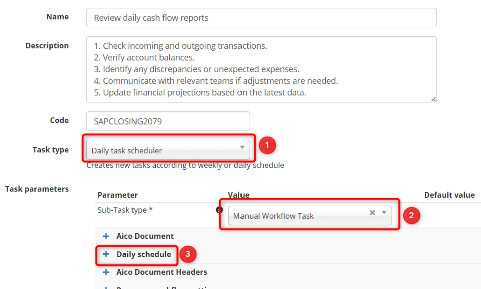 - Start by selecting the Daily task scheduler task type (1) and whichever sub task type (2) that you want to run. For example, Manual workflow or SAP program etc.