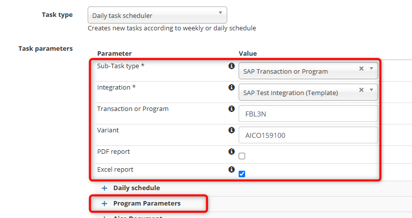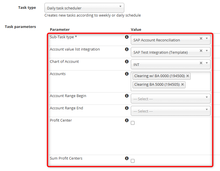 Note that the Program Parameters will not appear until you have selected your Transaction or program name. - SAP Account reconciliation will add the Account reconciliation task parameters.