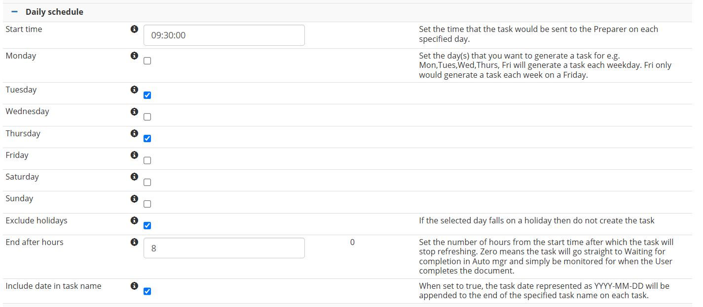 - The start time is the time of day that the task will be sent to the Preparer on each of the selected days.