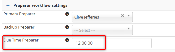 - Set the workflow roles (Preparer, Approver1 etc.) It is likely that such tasks will not have more than the Preparer role however all the roles are available as normal. The key difference on the daily tasks is that you can ONLY set a due time for each role (the due day etc. is hidden)