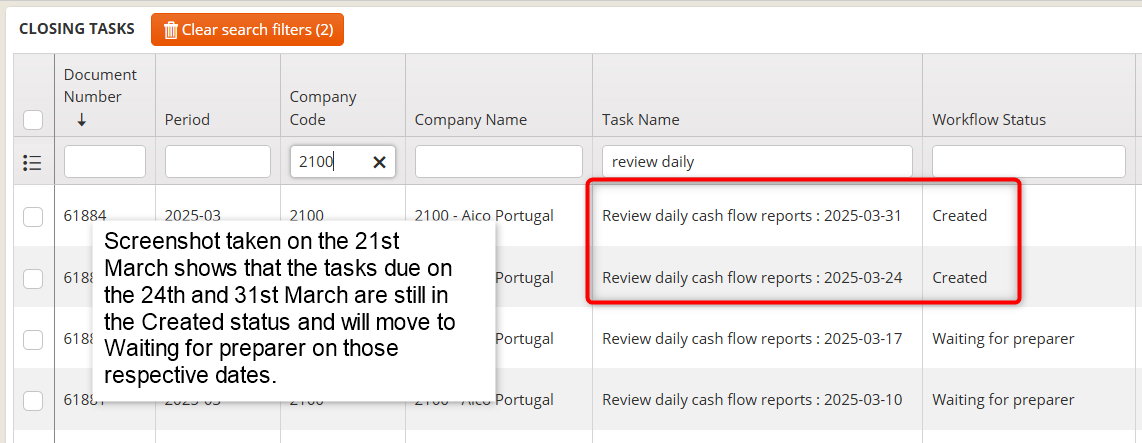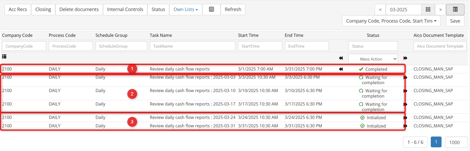 Looking at this from Automation manager. The top task (1) is the parent task from which all the daily tasks are generated. The tasks that are waiting for completion (2) are those which have already been sent to the preparer as their task dates are now in the past. The bottom 2 tasks (3) remain in the initialised status until their dates arrive and they are then sent to the preparer.